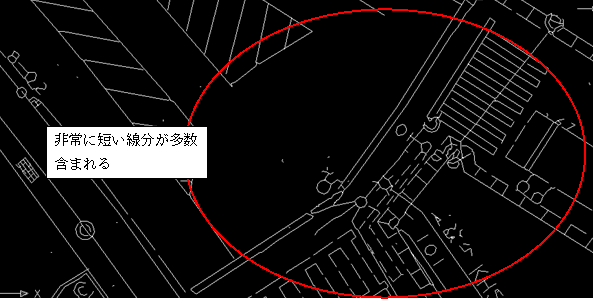 ラスタ形式のデータを自動ベクタ化機能でベクタ形式のデータに変換した結果、 ショートベクタが 多く含まれる状況となり、完成平面図のファイルサイズが非常に大きくなっています。 発注図が紙図面やラスタ形式のデータの場合は背景となる地形のデータをラスタ形式のまま利用するか、 作業上ベクタ形式のデータに変換したほうが良い場合には、線分を極力結合してファイルサイズを小さくします。